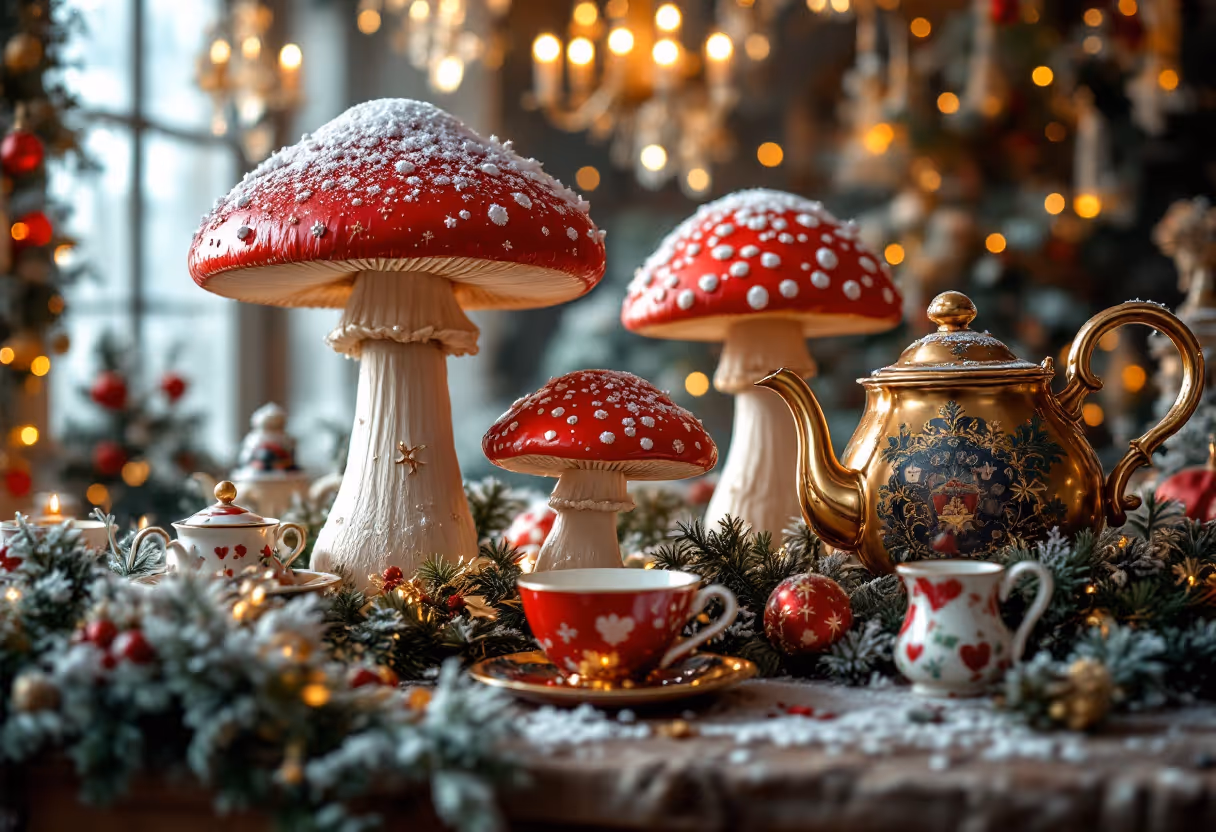 - Oversized props like mushrooms, pocket watches, and teacups dusted with snow.