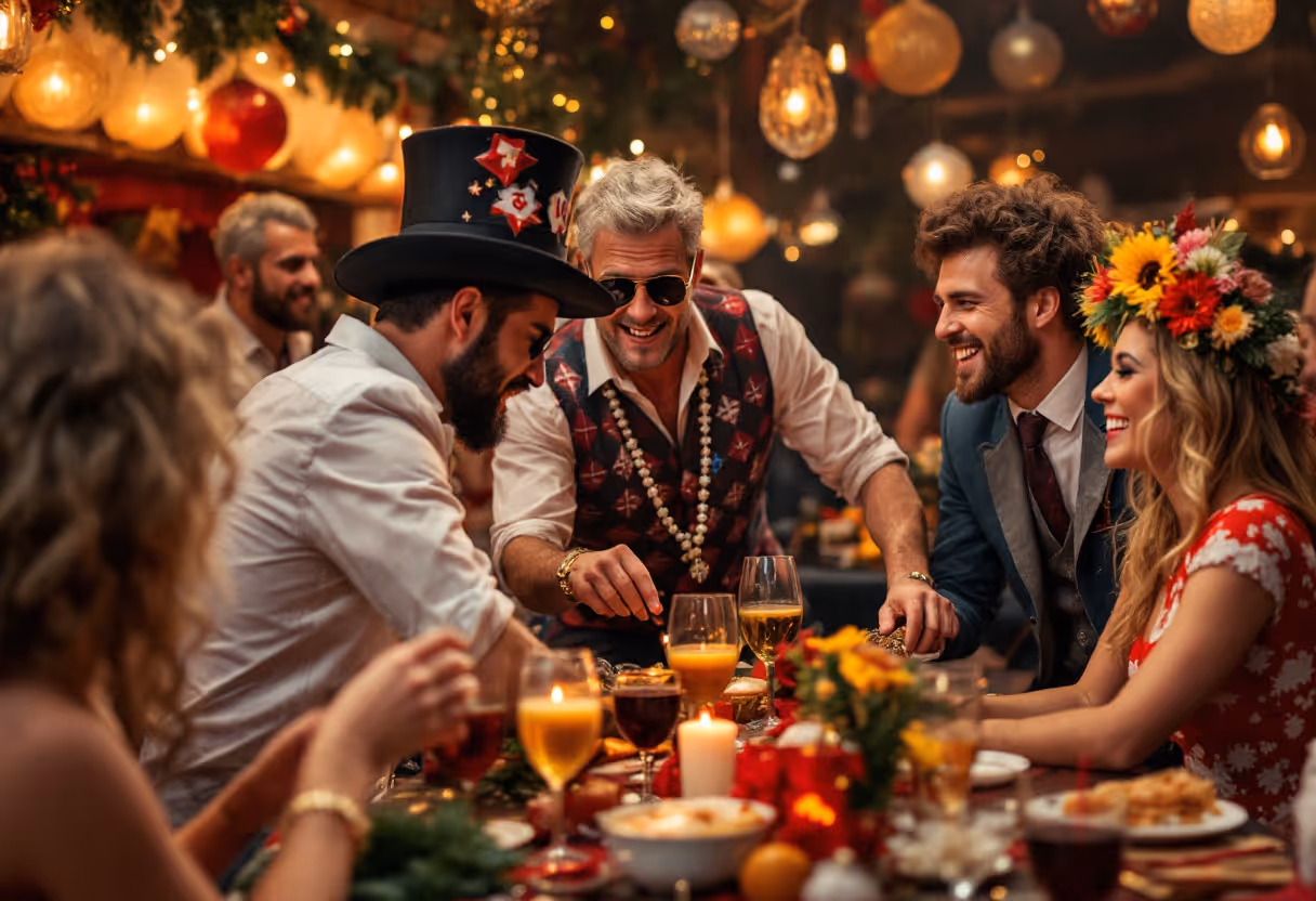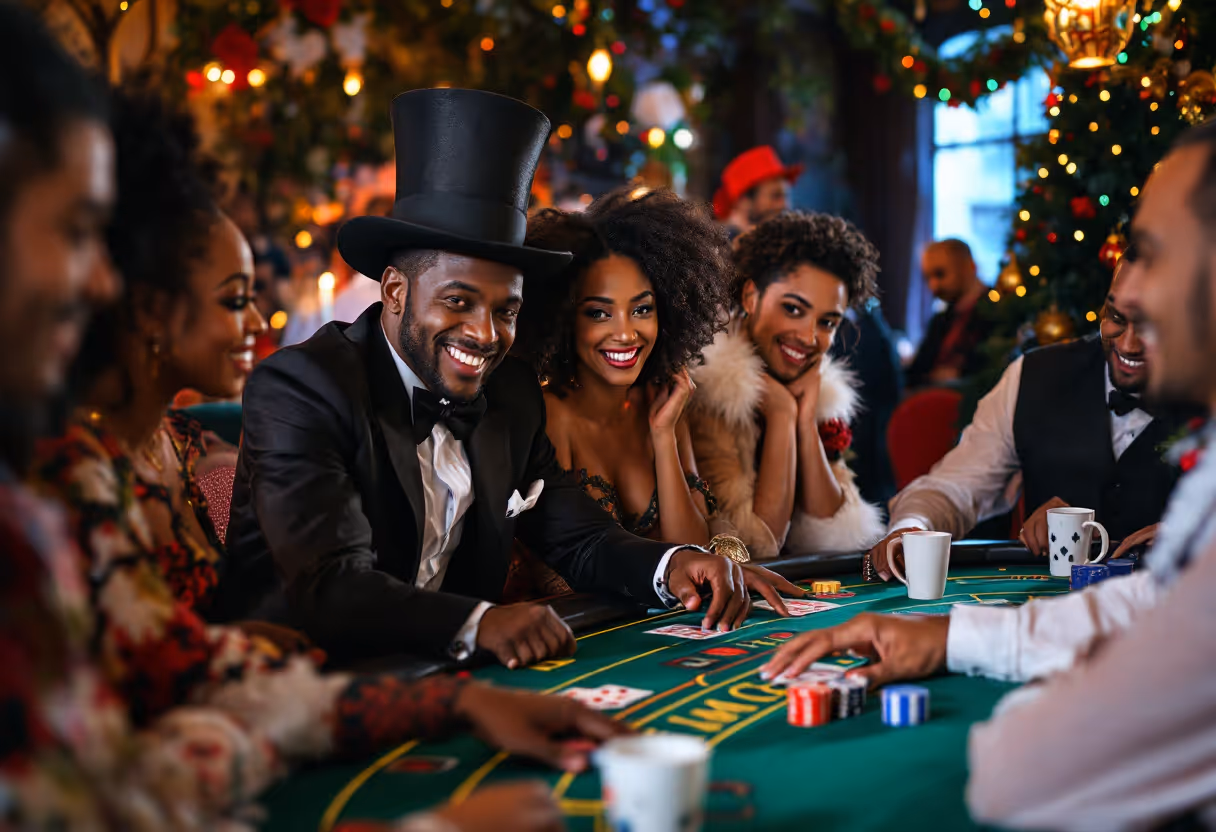 - Casino-inspired table settings with dice, playing cards, and festive ornaments.