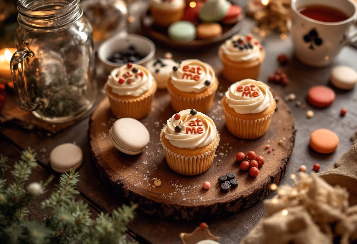 - Twinkling fairy lights and whimsical "Eat Me" and "Drink Me" tags.