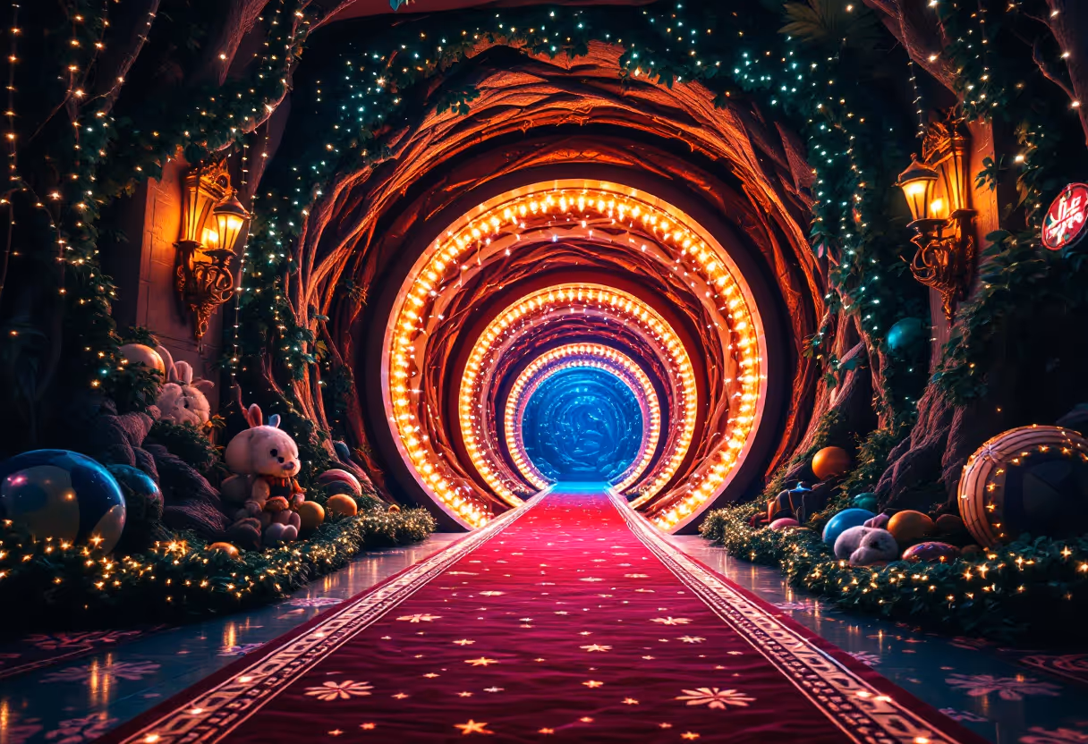 - Guests will enter through a magical "rabbit hole" adorned with sparkling holiday lights, leading to a red-carpeted Vegas-style entryway.